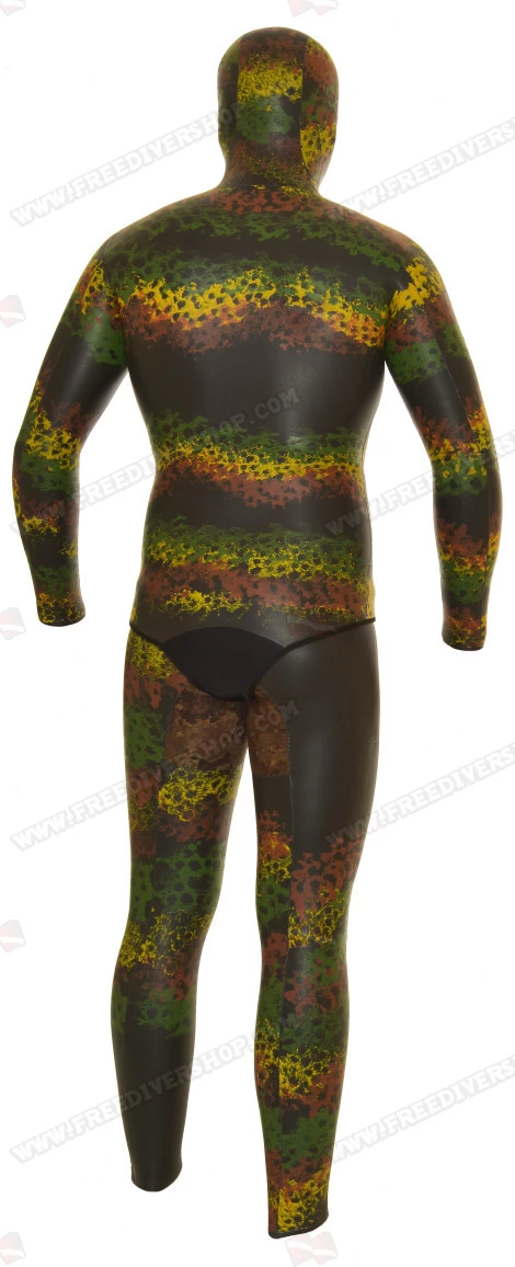 The suit is made of high quality Heiwa neoprene which offers top of the line thermal insulation and high resistance to neoprene compression at depth, with your choice of mimetic camouflage.