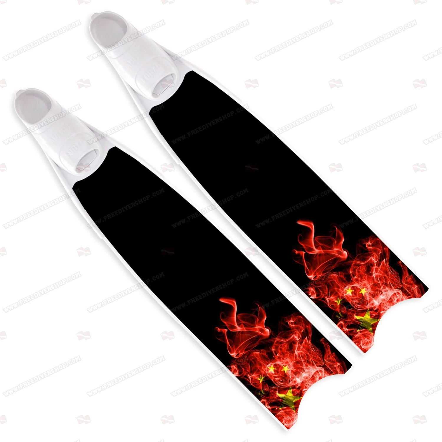 High quality limited edition freediving and spearfishing fins with Chinese Flame design, hand made blades from 100% carbon / fiberglass, processed under vacuum in molds.
