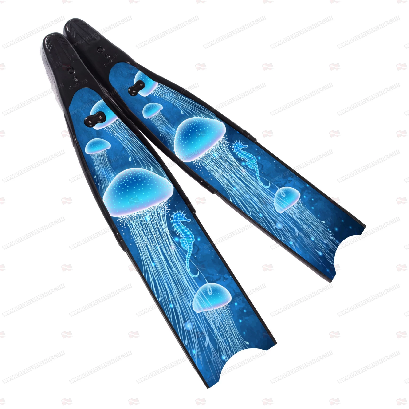 High quality limited edition freediving and spearfishing fins with Jellyfish design, hand made blades from 100% carbon / fiberglass, processed under vacuum in molds.