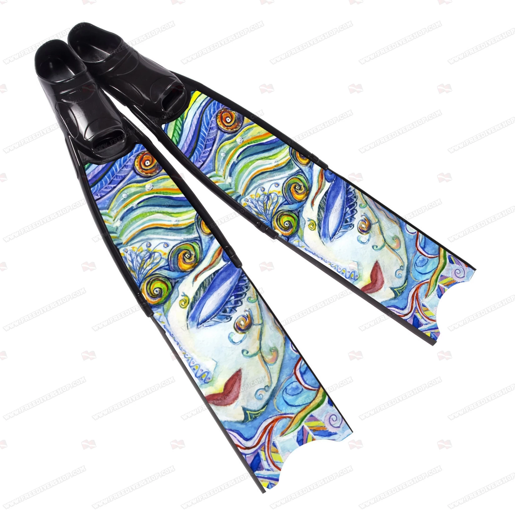 High quality limited edition freediving and spearfishing fins with Mermaid design, hand made blades from 100% carbon / fiberglass, processed under vacuum in molds.