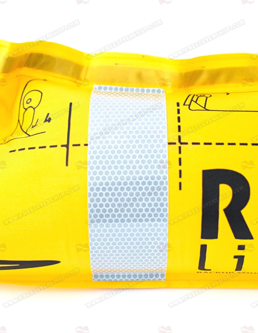 Once inflated, the signal-yellow Restube Lifeguard rescue buoy has a buoyancy of 75N (approx. 7kg), allowing resting and easily supporting of the victims head above water. The Restube Lifguard buoy has a C-shape design featuring a safety lanyard to easily attach the buoy to the victim and a high visibility reflector.